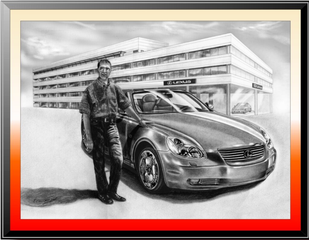 A striking Lexus SC430 captured alongside its proud owner — a celebration of power, design, and individuality. Every charcoal line mirrors the car’s precision, every shadow reflects the bond between man and machine. Handcrafted with care, this portrait turns automotive passion into timeless art.
